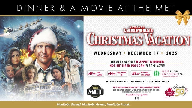 The Metropolitan Entertainment Centre, Winnipeg 281 Donald Street, , Winnipeg, CanadaThe events Christmas Vacation - Dinner and Movie will accure on 17/12/2025, start time 17:00:00 in The Metropolitan Entertainment Centre